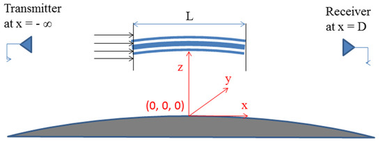 Let us assume the geometry of an Es layer scintillation problem in GPS/GNSS RO observations, as shown in Figure 1. A region of irregular electron density structures is located from x = −L/2 to x = L/2, where L could be the cutoff length of a GPS-LEO limb viewing link through an Es layer. A time-harmonic electromagnetic wave is transmitted by a GNSS satellite located at x = −∞, and it is incident on an Es layer slab at x = −L/2 and received by an LEO satellite receiver at a specific coordinate (x, ρt), where ρt = (y, z) is the transverse coordinate of wave propagation. The small-angle scattering of the scintillation phenomenon reduces the propagation equation of a wave field, where , to the parabolic wave equation in u(x, ρt), as follows [12].