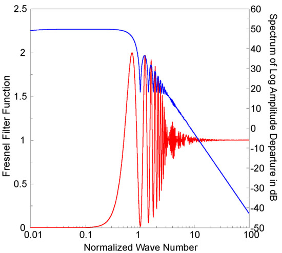 A Fresnel filter function of normalized wave number κt/κF in log scale (shown as the red line). The theoretical spectrum of the log amplitude departure of the wave field as a function of the normalized wave number κt/κF is also shown as the blue line.