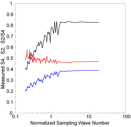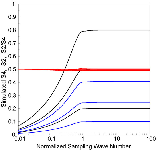 For different complete (saturated) S4 values of 0.8, 0.5, and 0.2, simulated scintillation index S4 (shown as the black lines) and normalized signal amplitude standard deviation S2 (shown as the blue lines) as functions of a normalized sampling wave number κs/κF in the log scale are shown from top to bottom separately. The ratio of S2/S4 as functions of κs/κF are also shown as the red lines, but almost overlap around a value of 0.5.