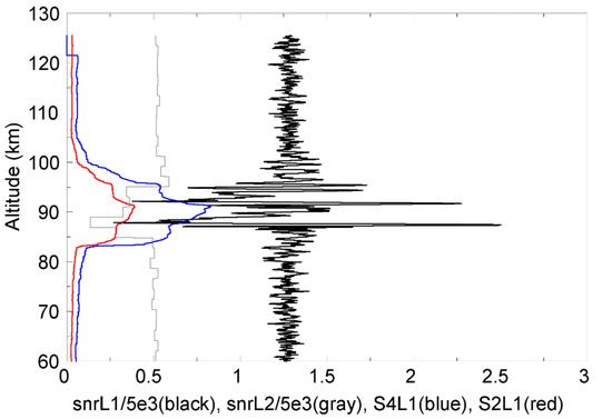 One example of FS3/COSMIC GPS RO observation with an Es event. The limb viewing L1- and L2-band SNR amplitudes of 50 Hz data versus GPS-LEO tangent point altitudes are shown in black and gray, respectively. The resulting S4 and S2 altitudinal profiles of GPS L1-band signals are also shown in blue and red, respectively. Notably, the peak S4 (S2) value is 0.82 (0.39).