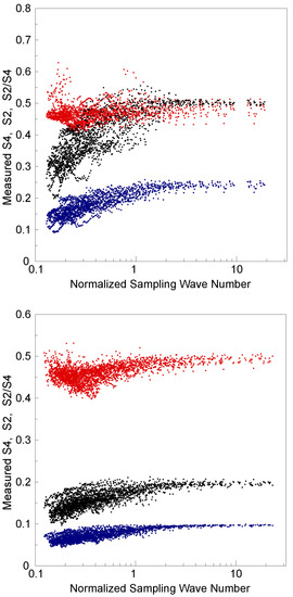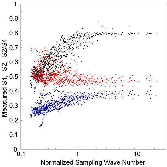 As mentioned, 50 Hz GPS-LEO limb viewing has a vertical sampling spatial scale of approximately 0.064 km, which is over one order less than the FFZ (~0.8 km) of the Es layer RO observation. We can perform de-sampling to obtain more sets of amplitude data at different sampling frequencies of 50/n Hz, where n = 1, 2,…, 100. The resulting one hundred sets of amplitude data can be used to derive different altitudinal S4 and S4 profiles using a 4 s sliding window, and obtain corresponding peak S4 and S2 values at sampling frequencies from 0.5 to 50 Hz, which are approximately equal to normalized sampling spatial scales κs/κF of 0.2 to 20. Figure 5 shows the measured peaks S4, S2, and their ratio S2/S4 values as a function of κs/κF based on the FS3/COSMIC RO amplitude data, as used in Figure 4. Notably, the measured peak S4 and S2 profiles in κs/κF fluctuate but are mainly similar to the simulated S4 and S2 profiles in the strong scintillation case of a complete S4 value of 0.8, as shown in Figure 3. The S4 and S2 values are saturated to ~0.8 and ~0.4, respectively, when κs is larger than κF, and, when κs is less than κF, the S4 and S2 values decrease in general as the logarithm of κs decreases. Figure 5 also shows the measured S2/S4 values to be more or less than 0.5 at different normalized sampling wave numbers κs/κF from 0.2 to 20, i.e., the measured S2 values are also approximately half of the measured S4 values whenever κs is larger or less than κF.