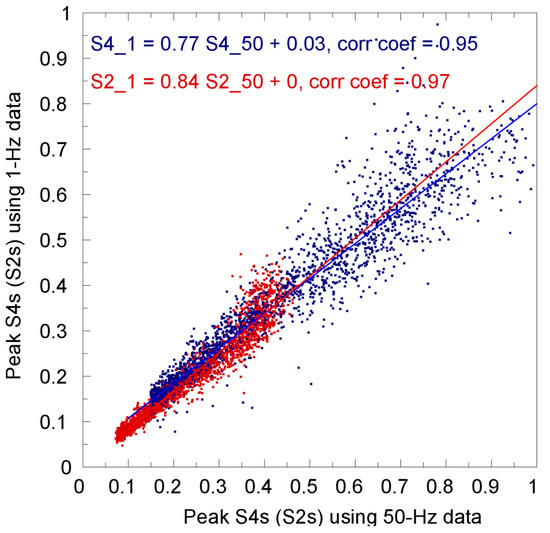 Scatter plot for the peak S2 values measured using 50 Hz (1-Hz) data versus the peak S4 values measured using 50 Hz (1-Hz) data is shown in blue (red). Two corresponding least-squares fitting lines, line equations, and the obtained correlative coefficients are also shown. As in Figure 7, the experimental FS3/COSMIC data were obtained on 1 January and 1 July 2007.