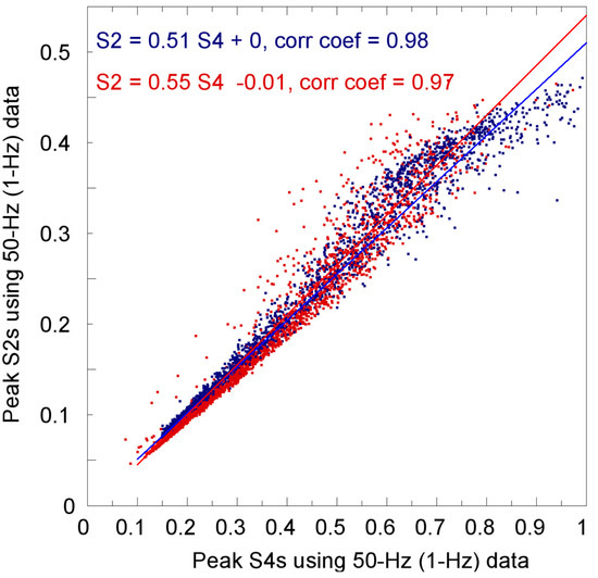 Scatter plot for the peak S4 (S2) values measured using 1 Hz data versus the peak S4 (S2) values measured using 50 Hz data is shown in blue (red). Two corresponding least-squares fitting lines, line equations, and the obtained correlative coefficients are also shown. The experimental FS3/COSMIC data were obtained on 1 January and 1 July 2007.