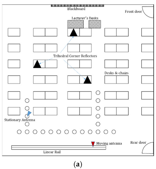 The location of the experiment and the GB-SAR system used for the one-stationary and one-moving antennae configuration in this paper was almost identical to [19]. A lecture room measured 8 m × 10 m was equipped with the array of desks and chairs, lecturer’s desks and a blackboard. Three trihedral corner reflectors (TCR) were put on the desks, as shown in Figure 1a. A linear rail system was installed at the back of the room which ensured the maximum scan length of 6 m. The rail was supported by three poles to have a height of 1.8 m from the ground. A Ku-band square horn antenna was installed on a moving platform on top of the rail. The motion of the antenna was precisely controlled by a stepping motor connected with a conveyor belt system, which provided a cumulative positional error of less than 0.1 mm. The stationary antenna that has identical specifications to the moving antenna was installed on a marked place as shown in Figure 1b. A total of 22 locations for the stationary antenna were marked on the ground. The location of the stationary antenna changed for each GB-SAR image acquisition in order to provide different viewing angles. They were separated by 50 cm with each other either in range or azimuth direction, and named from #−9 to #12, as shown in Figure 1b.
