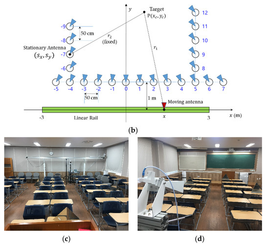 A ground-based synthetic aperture radar (GB-SAR) experiment with one stationary and one moving antennae inside a lecture room. (a) a diagram of the indoor targets and system, (b) a schematic geometry of the GB-SAR configuration, (c) a photo of the system and the targets, and (d) a photo of the lecture room seen from a stationary antenna with chairs and three trihedral corner reflectors.