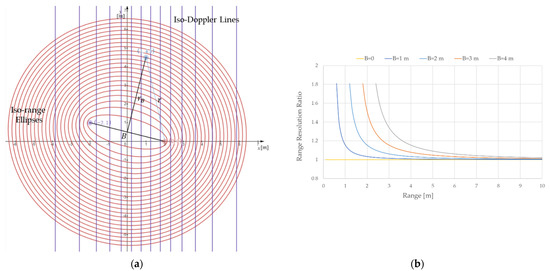 For one stationary and one moving antennae configuration in this study, the range resolution can be expressed as a bistatic case where two antennae are separated by a baseline of B as shown in Figure 2a. The iso-range planes are ellipsoids with two focal points located at each antenna position. As in [19], a bistatic range, , can be defined as a coordinate with the origin at the center of an iso-range ellipse and the direction of the semi-minor axis, so that where the monostatic range r is the distance from the antenna to a target in the direction of . The ratio of the two resolutions can be defined by [19]