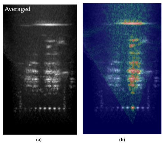 Multistatic GB-SAR after removing azimuth multiples. (a) An averaged image of all the images with various stationary antennae. (b) The scene #2 image in RGB color overlying the averaged image. Note that multiples were removed successfully.