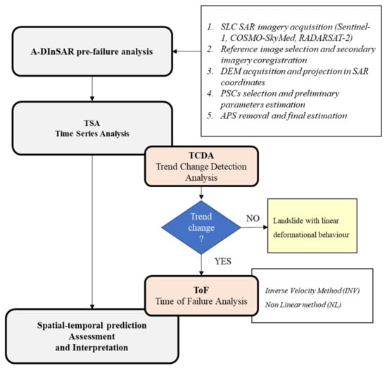 The study workflow is presented in Figure 2. The A-DInSAR retrospective analyses were carried out for the five case histories. Time series of displacement was analysed (TSA) to assess and classify the deformational behaviour of the landslides during the pre-failure stage. First, the TCDA was applied, followed by a full time of failure analysis in case of trend change identification.