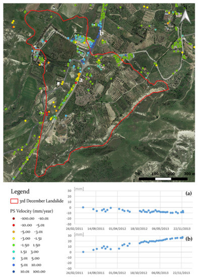 A-DInSAR pre-failure analysis for Scillato landslide (from [66], modified), including the average velocity map and the time series of displacement of two representative measurement points in sectors (a) and (b). (COSMO-SkyMed Product—©ASI—Agenzia Spaziale Italiana—(2017). All rights reserved). (Lat: 37.843329°; Lon: 13.914881°; WGS84).