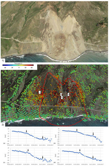 The A-DInSAR analysis in the pre-failure period was performed using 30 high-resolution COSMO-SkyMed Stripmap images acquired in the ascending acquisition between January 2013 and March 2015. The LOS angle with respect to the north was −168.8° and the incidence angle was 26.5°. Inside the landslide area, displacements were recorded in two different sectors (a and b in Figure 6). The major displacements were reached in the upper scarp of the landslide, in correspondence of route SP24, where displacement trends ranging from −2 to −8 mm/year were measured. Sector B is characterized by the presence of deformations with an average velocity of −3 mm/year, mainly affecting the old track of the SP24 route, which collapsed during the 2005 landslide event. The time series of displacement are characterized by linear deformational behaviour.