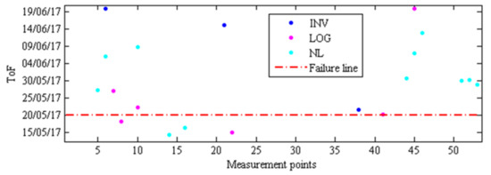 - The INV analysis (Figure 3a [32,38]), based on the linear regression analysis using the inverse velocity versus time data. The ToF is defined as the intercept between the linear regression line and the x-axis;