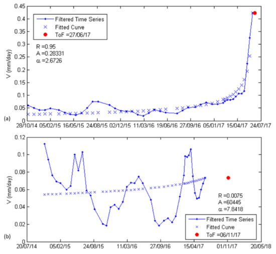 where is the acceleration, is the velocity, A and α are semi-empirical constants. The author suggested that several parameters could be used in the relation (e.g., strain, rotation, translation or seismic-energy release), thus including any kind of precursor phenomena which can be measured in terms of velocity and acceleration. Based on equation 1, different failure forecasting methods were proposed [35]. In this study, we make use of the following two forecasting methods: