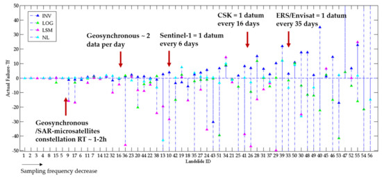 Assuming the presence of a coherent target in correspondence with a landslide area is satisfied, Moretto et al. 2017 [40] performed a first quantitative analysis concerning the “Assessment of Landslide Pre-Failure Monitoring and Forecasting Using Satellite SAR Interferometry”, considering two major limitations of the technique to monitor the pre-failure behaviour: (i) The revisit time (i.e., the sampling period of the data acquisition) and (ii) the phase ambiguity constraints. The acquisition of slope deformations before the collapse was simulated for 58 landslides, considering the features of satellite missions of the past, present and future. From the study, it was found that 30% of the landslide events collected could have been monitored during the acceleration phase considering the current features of Sentinel-1 constellation.