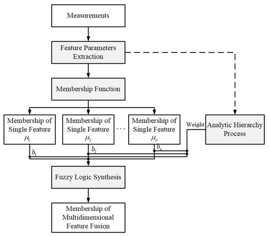 Therefore, a multidimensional feature fusion strategy based on fuzzy logic synthesis theory is proposed to obtain the membership of the multidimensional feature fusion. The flow diagram of this strategy is shown in Figure 2. It mainly includes four key modules, as shown in the grey boxes. Firstly, the feature parameters of measurements are extracted in real time. Secondly, a new membership function, the fitting probability distribution function (PDF) ratio of the target and clutter feature parameters, is designed to adapt to the characteristics of insect targets. Meanwhile, the analytic hierarchy process (AHP) is employed to calculate the weight of each feature. In the end, multidimensional feature fusion is realized by fuzzy logic synthesis.