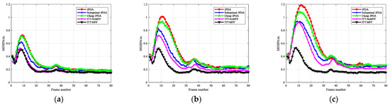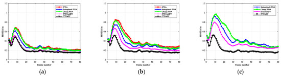 Figure 9. MOSPA comparisons of the six target scenarios with different clutter densities. (a) λ = 10 5 ; (b) λ = 10 4 ; (c) λ = 10 3 .