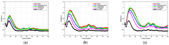 The comparison results of the algorithm’s STR in different simulation scenarios are shown in Table 4. For JPDA, suboptimal JPDA, cheap JPDA, and ITT-NoMFF, without the aid of multidimensional features, the STR decreases with an increase of clutter density. With an increase in the number of targets, the magnitude of this decline increases. Notably, when the clutter density is 10−3 and the number of targets is greater than four, the STR drops to less than 50%. However, the ITT-NoMFF algorithm is superior to cheap JPDA and suboptimal JPDA, and is basically the same as the JPDA algorithm, which verifies the validity of the distance-correction factor. Besides, the proposed ITT-MFF algorithm is robust in cluttered background due to the use of multidimensional feature fusion. Moreover, when the clutter density is 10−3, the successful tracking ratio of ITT-MFF can still be guaranteed as greater than 90%. Therefore, compared to other algorithms, ITT-MFF offers more stable tracking performance.