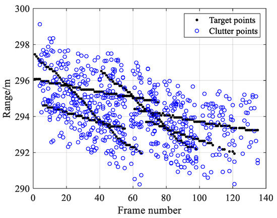 After CFAR detection processing, the target measurement sets were acquired, as shown in Figure 12. For this study, we selected six insect target trajectories, including parallel and crossing situations. To evaluate the algorithm’s tracking performance in different clutter densities, a semi-physical simulation experiment [38] was adopted. We assumed that the positions of the clutter measurements were uniformly distributed around the target measurements, and set the clutter density to 10−3. The target feature parameters were obtained in real time based on the theoretical formulas in Section 3.1.1, and the clutter feature parameters were subjected to the PDF distribution model obtained in Section 3.1.2.