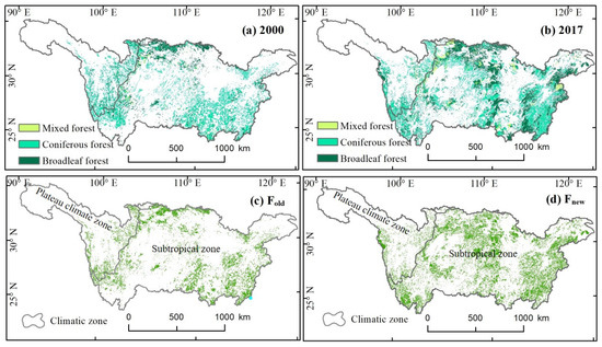 The distributions of (a) 2000 forest, (b) 2017 forest, (c) old forest (Fold), and (d) new forest (Fnew) in Yangtze River Basin, China.