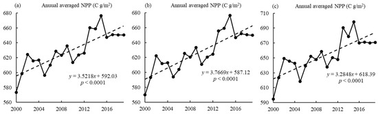 Furthermore, as an important indicator of forest health states, forest net primary productivity (NPP), referring to the rate of net carbon fixed through photosynthesis by forestland, directly represents the production capacity of the forest [2]. NPP is widely applied in climate change research to analyze forest restoration or degradation trends in various climate zones and forest types in the past few decades [3]. NPP change trend is usually considered as a proxy for forest restoration or degradation [4,5]. An increasing NPP trend means forest restoration while a decreasing trend indicates forest degradation.