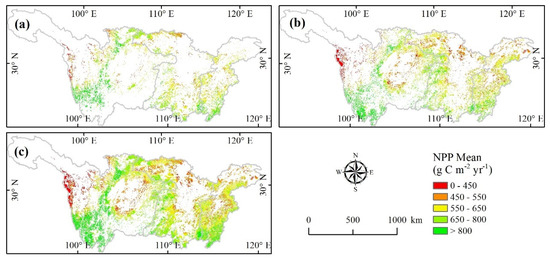 The spatial variations of NPP from 2000 to 2019 were shown in Figure 4. The annual average NPP of Fnew in YRB ranged from 100.80 g C m−2 to 1419.50 g C m−2. Besides, the annual average NPP of Fold and Fnew exhibited different spatial variations. For Fold, the higher regions were mainly distributed in the upper of YRB. For Fnew, it markedly increased from the northwest to the southeast of the upper of YRB (Figure 4b). More specifically, the higher NPP values were distributed in Sichuan and Yunnan (>800 g C m−2 year−1, Figure 4). Conversely, the lower NPP values were in the northwest of the YRB (<200 g C m−2 year−1, Figure 4).