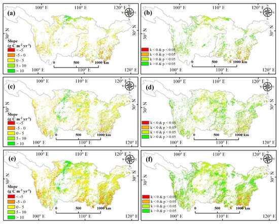 Net primary productivity (NPP) trend of (a) the old forest, (c) the new forest, and (e) all forest, (b,d,f) their corresponding.