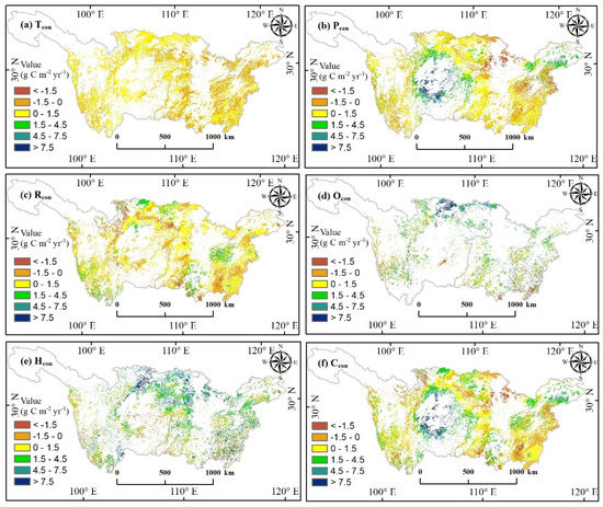 The contributions of climate factors and human activities to net primary productivity (NPP) trend from 2000 to 2019 in YRB, China. (a) temperature, (b) precipitation, (c) solar radiation, (d) other climate factors, (e) human activities, and (f) climate.