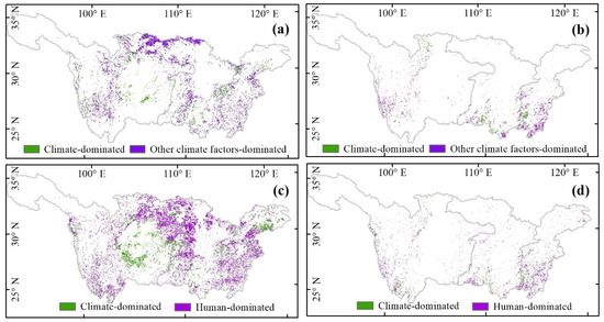 Spatial distribution of the climate-dominated, and other climate factors-dominated (a,b) new forest restoration and degradation areas, respectively; and the climate-dominated, and human-dominated (c,d) old forest restoration and degradation areas, respectively.