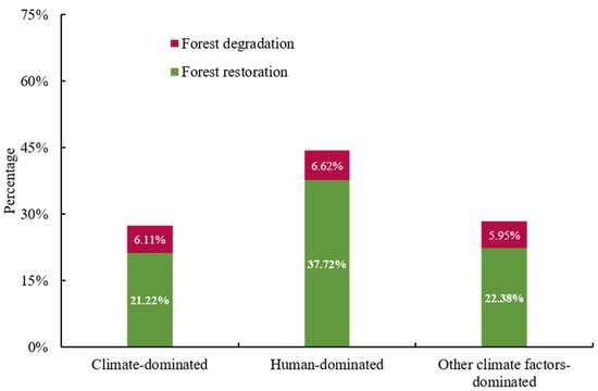 Statistical analysis of the percentages of climate-dominated, human-dominated, and other climate factors-dominated forest restoration and degradation.