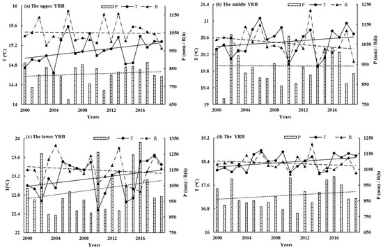 Changes in annual of T, P, and R in (a) the upper of Yangtze River Basin, (b) the middle of Yangtze River Basin, (c) the lower of Yangtze River Basin, and (d) the Yangtze River Basin. (T: temperature, P: precipitation, R: solar radiation).