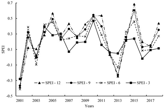 Monthly meteorological data consists of precipitation, temperature, and solar radiation from 2000 to 2019, which are available in the National Earth System Science Data Center (http://www.geodata.cn/, accessed on 15 September 2021) [22,23]. With a 1 km spatial resolution, the average temperature, total precipitation, and solar radiation during the growing season (from April to October) (2000–2019) were calculated. To evaluate the impact of climate on forest NPP more comprehensively, annual values of the Standardized Precipitation Evapotranspiration Index (SPEI) were applied [24]. Annual SPEI of different time scales were considered such as 1, 3, 6, 9, and 12 months. The SPEI data were obtained from the website https://digital.csic.es/handle/10261/202305 (accessed on 15 September 2021). Its spatial resolution is 0.5°.