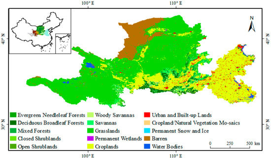 The Yellow River Basin, which includes the Yellow River drainage system, the Yellow River flood disaster area, and the Yellow River agricultural irrigation area, is located between 96°~119° E, 32°~42° N, 1900 km from East to West and 1100 km from South to North, with an area of 1.4129 × 106 km2 (Figure 1) [56,57,58]. The elevation of the Yellow River Basin is high in the West and low in the East and crosses the Qinghai-Tibet Plateau, Inner Mongolia Plateau, Loess Plateau, and the Huang-Huai-Hai Plain. The Yellow River Basin is the most important ecological barrier in China [59]. The main land-cover types are grasslands, croplands, barren lands, deciduous broadleaf forests, savannas, urban and built-up lands, mixed forests, and woody savannas (>1 × 104 km2) (Figure 1, Table 1). The Yellow River Basin spans the arid, semi-arid, and semi-humid climates, from arid in the Northwest and to humid in the Southeast. The annual average air temperature is between 4–14 °C, the annual rainfall is concentrated in 200–800 mm, and air temperature and precipitation are unevenly distributed and have drastic seasonal changes: hot and rainy in summer, cold and dry in winter [60].
