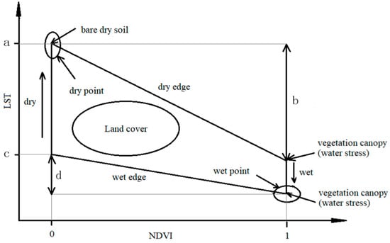 In Equation (2), LST is the LST observation for each pixel, and LSTmin and LSTmax are obtained by Equations (3) and (4), respectively, where a, b, c, and d are wet and dry edge parameters estimated in the whole study region. The specific method of dry and wet edge fitting is to divide the interval [0,1] into 100 intervals, extract the maximum and minimum LST values where the NDVI values lies in the corresponding interval, and obtain 100 maximum values and minimum values, respectively. Then, the dry edge equation and the wet edge equation can be obtained by linear fitting (Formulas (3) and (4)). Figure 2 shows an example diagram of the fitting of the dry and wet edge equations.