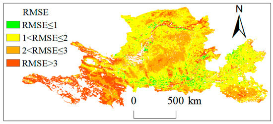 The Root Mean Square Error (RMSE) is a statistical indicator characterizing the deviation size of the true and predictive values, a smaller RMSE value indicates a smaller deviation. It can be calculated by Equation (6). To analyze the consistency between ATC LST and MODIS LST, the RMSE distribution of the difference between ATC and MODIS LST were calculated. The results can be found in Figure 3.