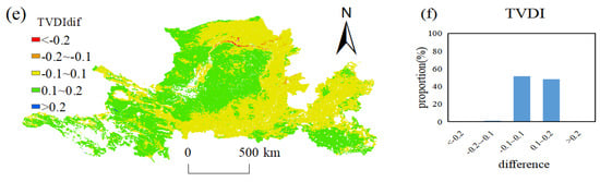 Statistics of the difference between ATC and MODIS drought indices. (a) Spatial distribution of TCIdif; (b) percentage statistics of different TCIdif pixels; (c) spatial distribution of VHIdif; (d) percentage statistics of different VHIdif pixels; (e) spatial distribution of TVDIdif; (f) percentage statistics of different TVDIdif pixels.