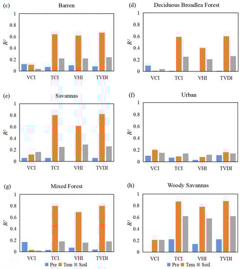 Correlation of the drought index with precipitation, air temperature, and soil moisture. (a) Grasslands; (b) croplands; (c) barren; (d) deciduous broadleaf forest; (e) savannas; (f) urban; (g) mixed forest; (h) woody savannas.