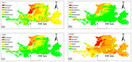 The values of the four typical drought indexes range of 0 and 1; the larger the TVDI values, the more arid the region, while smaller values of the other three indexes represent more arid regions. Table 5 lists the correspondence of the magnitude of the 4 drought indexes [66].
