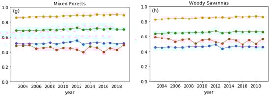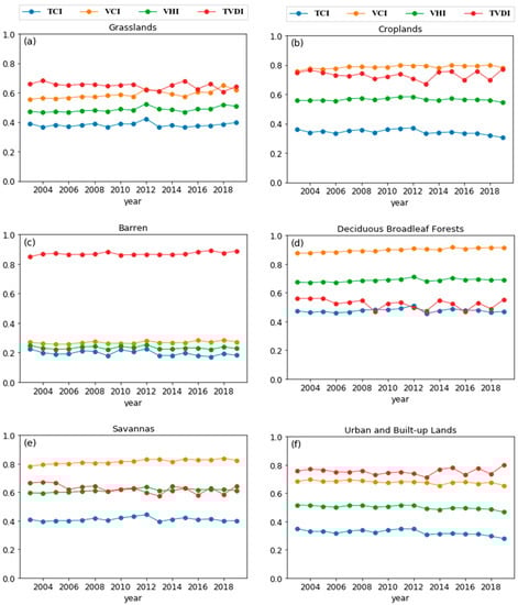Time series analysis of drought indices in different land types. (a) Grasslands; (b) croplands; (c) barren; (d) deciduous broadleaf forests; (e) savannas; (f) urban and built-up lands; (g) mixed forests; (h) woody savannas.