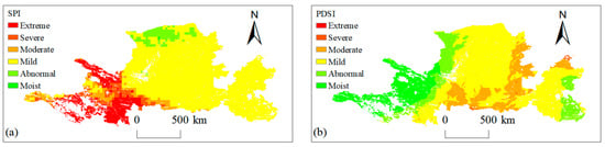Average of SPI and PDSI with a 1-month time scale during the period 2003–2019. (a) SPI; (b) PDSI.