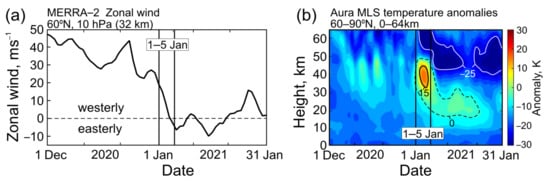 The MERRA-2 reanalysis shows a sharp deceleration of zonal wind at 10 hPa, 60°N, with maximum weakening from 1 to 5 January 2021 (vertical lines in Figure 1a) and the appearance of weak easterlies in early January. Relative to the MLS climatology of 2004–2020, the stratospheric temperature poleward of 60°N increased by about 15 K (Figure 1b), the zonal wind reversed in early January at 10 hPa, 55–65°N, and the SSW event became defined as major [,]. In the ERA5 reanalysis, a major SSW began on 5 January 2021, and the average temperature of the Arctic stratosphere at 10 hPa rose by close to 30 K in under a week before the onset of the SSW []. Similar to Figure 1a from MERRA-2 data, the magnitude of the easterlies in ERA5 data was not particularly remarkable for a major SSW, and the strongest easterlies of –9.3 ms–1 occurred on 15 January [].