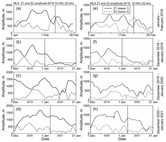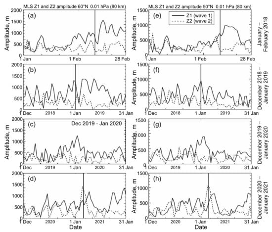 Wave amplitude variations in the stratosphere (10 hPa) and mesosphere (0.01 hPa) in winter 2020–2021 are compared with those in the three preceding winters 2018–2020 in Figure 2 and Figure 3. The anticorrelation between Z1 and Z2, which is clearly visible in the stratosphere at 60°N and 50°N (Figure 2, left and right, respectively), was not observed in the mesosphere, where wave amplitudes varied more frequently in time and they were not so noticeably different in amplitude (Figure 3 and Table A1). The 2-month mean ratio between the wave amplitudes Z1/Z2 in Table A1 decreases upward (e.g., 2.0–3.2 and 1.7–2.5 at 32 km and 80 km, respectively, both at 60°N) and increases poleward (e.g., 1.3–1.8 and 1.7–2.5 at 50°N and 60°N, respectively, both at 80 km). At times, an increase in the amplitude of wave 2 in the mesosphere preceded that of wave 1 (the 2020–2021 winter, Figure 3d,h); this also occurred in the 2018–2019 winter (Figure 3b,f). As far as we know, this effect has not previously been described.
