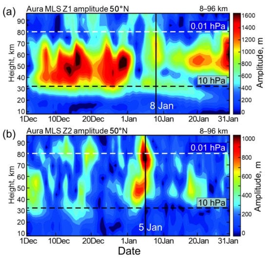 Time–altitude sections of Z1 and Z2 also show that the amplification of wave 2 in the mesosphere (60–80 km) during SSW 2021 leads that of wave 1 by about three days (vertical lines on 5 January and 8 January in Figure 4a,b, respectively). Additionally, as in the case of wave amplitudes in the mid-stratosphere at 60°N (Figure 2, left), there are no noticeable amplitude anomalies at 50°N in early January (the 10-hPa pressure level is shown by black dashed lines in Figure 4a,b). The Z1 and Z2 amplitude variations are even smaller in the lower stratosphere at about 20 km (<300 m, Figure 4, see color scales), which is evidence of relatively low planetary wave activity. This is consistent with the absence of a zonal wind reversal at these altitudes at 55–65°N during the SSW onset []. The weak SSW manifestations in the wave 1–2 amplitudes in the lower–middle stratosphere may explain why the SSW 2021 cannot be clearly classified as having a splitting or displacement of the stratospheric polar vortex []. In contrast, wave amplitudes at 50°N are much larger in the upper stratosphere/mesosphere and reach 1600 m and 1000 m for Z1 and Z2, respectively (Figure 4). Easterlies also increase with altitude up to –40 ms–1 []. Therefore, the SSW 2021 event is mostly developed above 10 hPa pressure level indicated by a black dashed line in Figure 4.