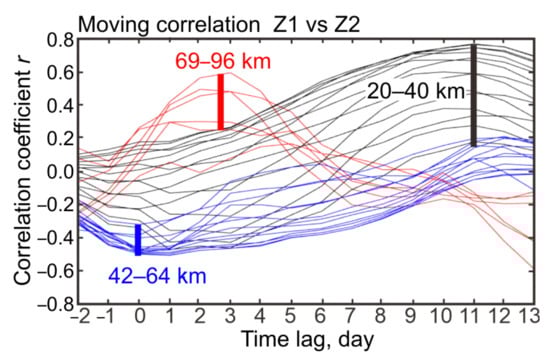 The leading role of wave 2 is also seen in the intermediate layer 42–64 km (upper stratosphere–lower mesosphere, blue curves in Figure 5). However, a negative correlation predominates around zero lag (blue vertical line in Figure 5), and the minimum correlation r ~ –0.4 appears at l–5-day lags. With a further increase in the time lag, the r-values become insignificant (blue curves). A weak negative (strong positive) correlation near zero time lag (lag of 6–13-days) exists in the lower–middle stratosphere in the altitude interval of 20–40 km (Figure 5, black curves). The maximum correlation r = 0.6–0.8 is reached when wave 1 lags relative to wave 2 by 11 days (black vertical line). Therefore, a common feature of the coupling between waves at different altitudes is the time lag in the activity of wave 1 in comparison with wave 2; however, the sign, magnitude, and time lag of the strongest correlation are very different. A particularly noticeable feature is the abrupt transition to a positive lagged correlation ‘Z2 vs. Z1’ in the upper mesosphere–mesopause region (red curves in Figure 5).