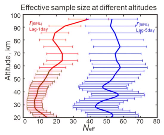 In the mesosphere, Neff decreases to 20–30 days with lag-1 autocorrelation but increases to ~55 days with lag-5 autocorrelation (red and blue curves in Figure 6, respectively). As Neff increases with longer lags, the 95% confidence intervals narrow, as shown by the dashed curves in Figure 7.