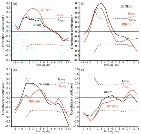 It can be seen that the positive moving correlation at altitudes of 91, 85, 80, and 75 km is statistically significant at the 95% confidence limit when Z2 leads Z1 by 1–5 days and the maximum r = 0.5–0.6 is reached at a 3-day leading (Figure 7a–c). The appearance of the positive lagged relationship between wave 1 and wave 2 in the upper mesosphere–mesopause region (Figure 7) quantitatively characterizes their time-dependent interaction and indicates that their origin can be independent of stratospheric waves as noted earlier [,,,].