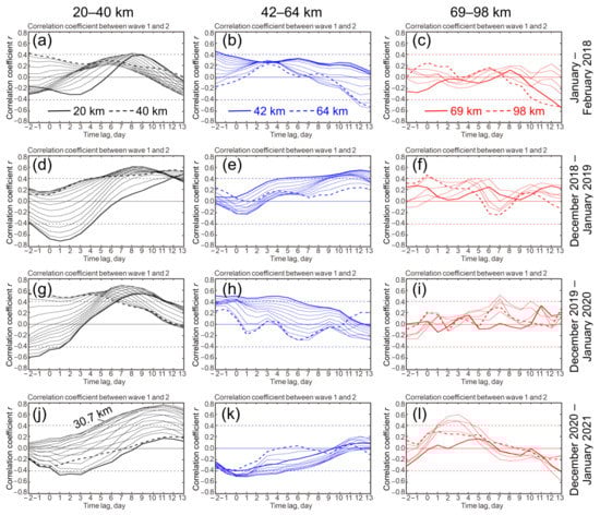 Moving correlation between amplitudes of wave 1 (Z1) and wave 2 (Z2) with time lag from –2 days to +13 days. Altitude ranges (left) 20–40 km, (middle) 42–64 km, and (right) 69–98 km are shown. Each curve represents a different pressure level, and the thick solid (dashed) curves show the lowest (highest) levels in each altitude range. From top to bottom: winters (a–c) 2018, (d–f) 2018–2019, (g–i) 2019–2020, and (j–l) 2020–2021.