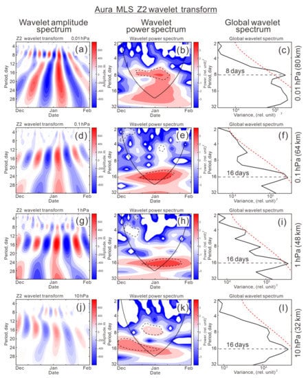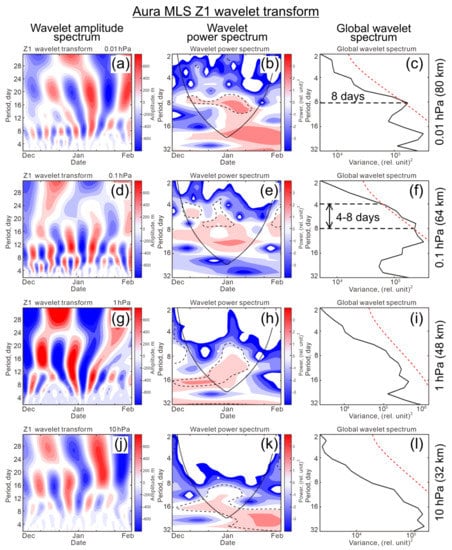Note that unlike the presence of short mesospheric periods in waves 1–2 in Figure 9a–c and Figure 10a–c and in wave 1 in [], both in geopotential height, they are absent at mesospheric pressure levels in the MLS temperature []. This may be due to the fact that geopotential height is sensitive not only to the temperature anomalies at the single pressure level but integrates the temperature–pressure effect in the atmospheric layers below [] and can give more complete information about the wave spectra.
