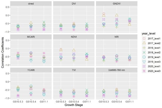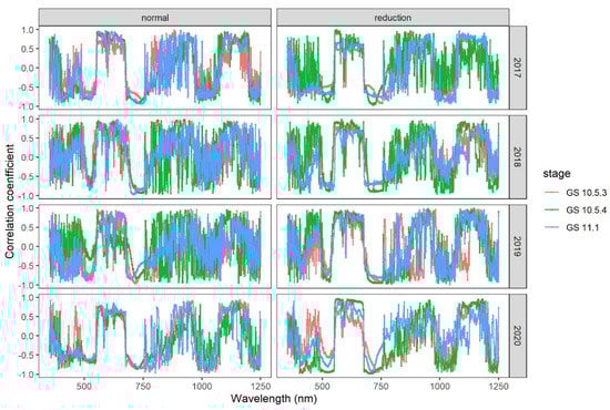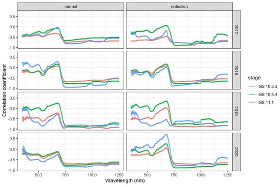 The overall patterns of correlation of canopy spectral reflectance with mildew DI were similar at the three growth stages under both the standard and reduced nitrogen input levels in all four seasons (Figure 1). Correlation between the spectral reflectance in the visible red wavelengths (650–680 nm) and DI differed in its magnitude among seasons; for the low nitrogen input treatment, the correlation was only significant at GS10.5.3 in 2017, and GS11.1 in 2019 and 2020. There was no significant correlation between the reflectance of the red band and DI for the standard nitrogen input treatment. The reflectance of the near-infrared band (750–880 nm) was negatively correlated with DI: the correlation coefficient was less than −0.50.