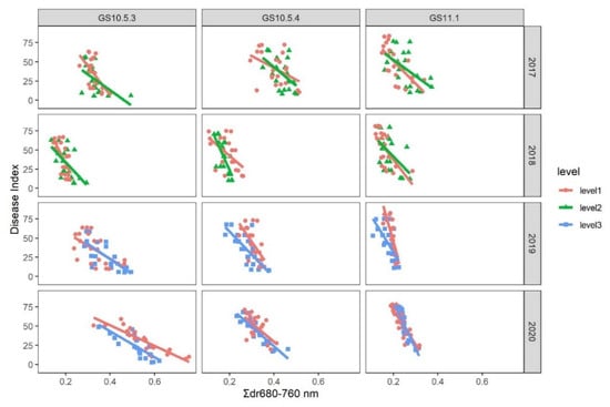 Initial correlation analysis suggested that canopy reflectance Σdr680–760 nm is the best overall predictor of wheat powdery mildew severity and grain yield. Thus, linear regression of mildew DI and yield with Σdr680–760 nm was carried (SAS Institute Inc., Cary, NC, USA). Initially, linear regression modeling was used to estimate the variability in the mildew disease index or grain yield accounted for by nitrogen input levels, growth stages, Σdr680–760 nm, and their interactions; in this analysis, the season was treated as a blocking factor. This initial analysis suggested large effects of season and growth stage on the mildew DI/yield − Σdr680–760 nm relationships. Thus, regression analysis was applied to each combination of season and growth stage for testing the effects of nitrogen input on mildew DI/yield − Σdr680–760 nm relationships through parallel curve analysis.