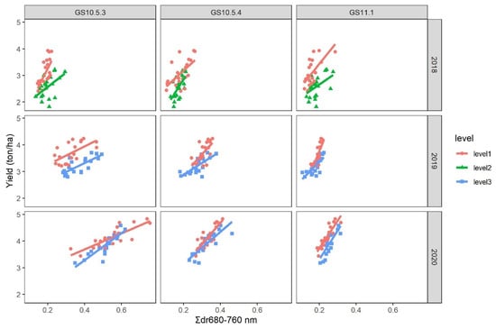 Fitted regression models relating Σdr680–760 nm (a spectral parameter derived from canopy reflectance) to grain yield at two nitrogen input levels among different growth stages and years.