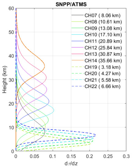 The weighting function and peak sounding height of SNPP ATMS channels CH07–CH14 and CH19–22 studied in this paper.
